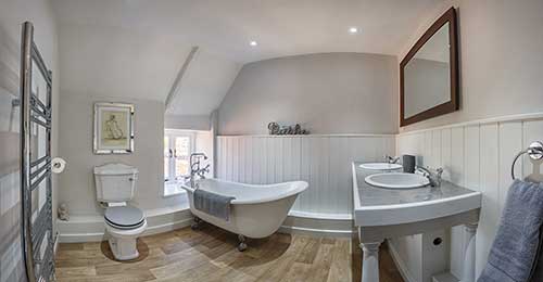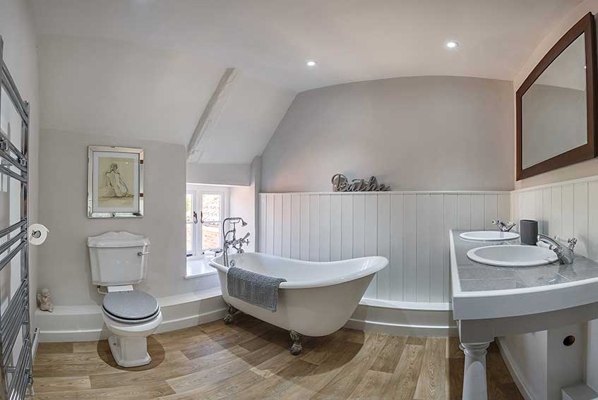 Roll top, claw foot bath with a double sink and a heated towel rail. Shower with a toilet, sink and heated towel rail.