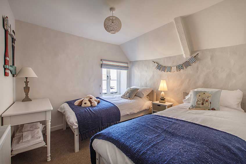 Twin bedroom. All beds have duvets and throws and the bedlinen is Egyptian cotton.Two luxurious large bathsheets and two handtowels for each room are provided and replaced weekly, and there is ample storage in the French style furniture for all belongings. Hairdryer supplied. With field and garden view.