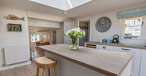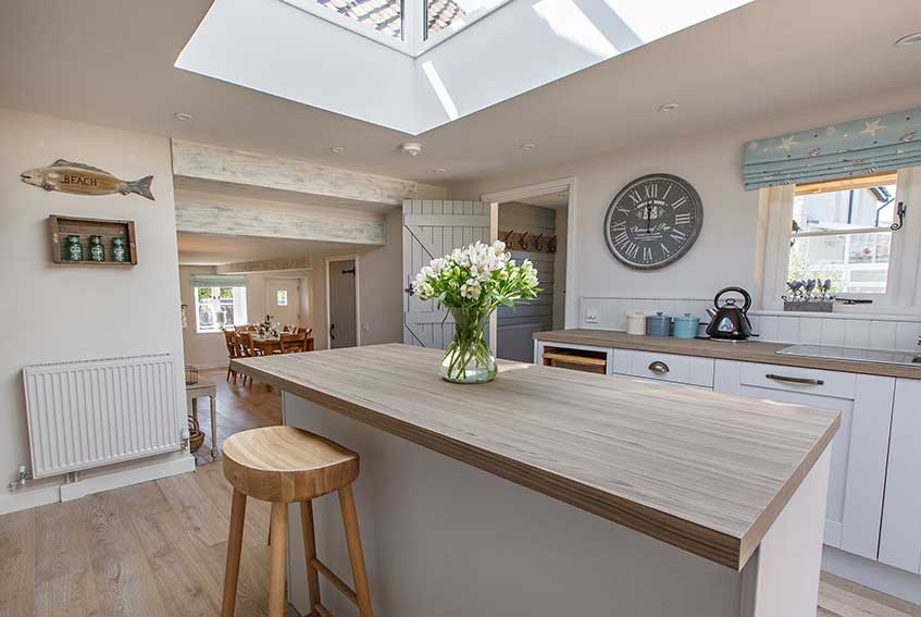 With its large roof lantern the big blue sky becomes an integral part of the cottage and allows the sun to flood in. The cream shaker style units have solid oak work surfaces and there is a central island with oak breakfast stools to watch the other half cooking! With the Belfast sink, electric oven with a ceramic hob, under counter fridge, dishwasher and many more extras you have all cooking implements you would expect in your own home. Oak flooring. The Utility Room has a washing machine, airer, freezer, microwave and downstairs cloakroom. The large pantry and store cupboard (houses iron, board etc.). Ideal for storing the luggage.